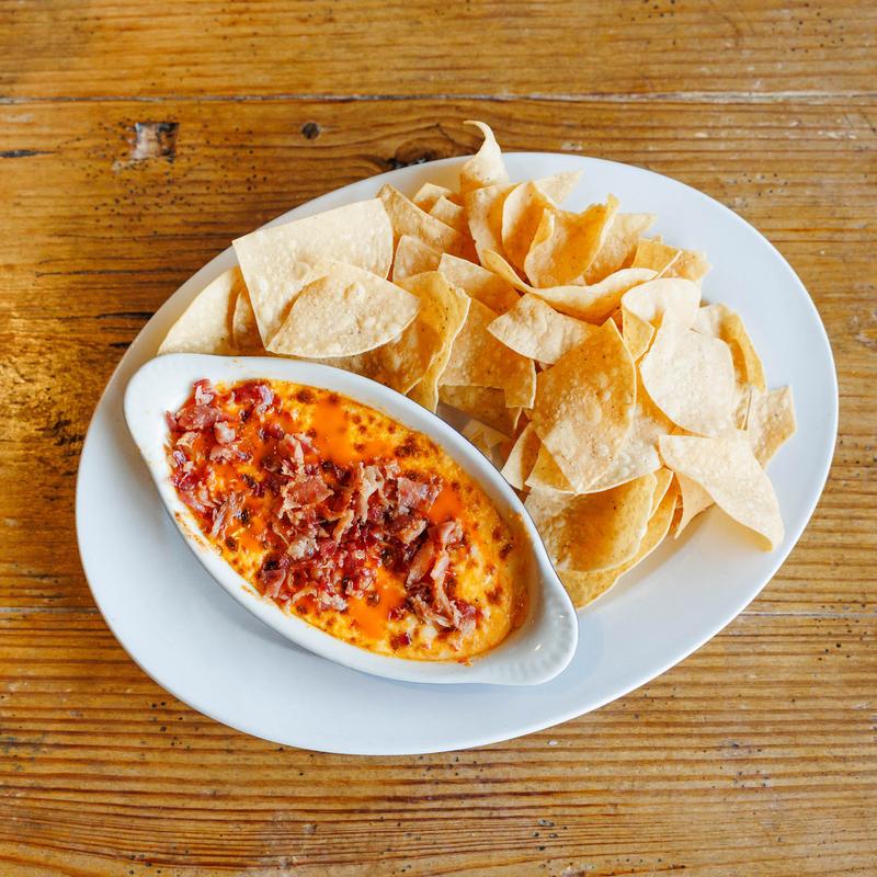 Homemade pimento cheese baked & topped with Buffalo sauce & bacon bits. Served with choice of tortilla chips or pita chips